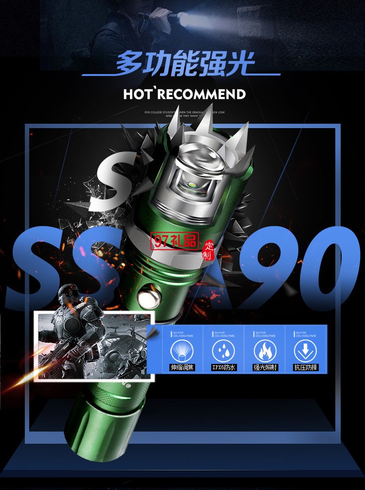 帶攻擊頭強(qiáng)光手電筒 LED可充電鋁合金手電筒 戶外防身手電