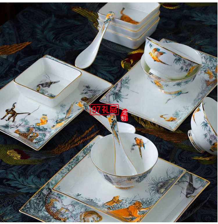 HERMES”愛馬16頭骨陶瓷鎏金餐具套裝赤道叢林系列方形盤碗碟勺禮