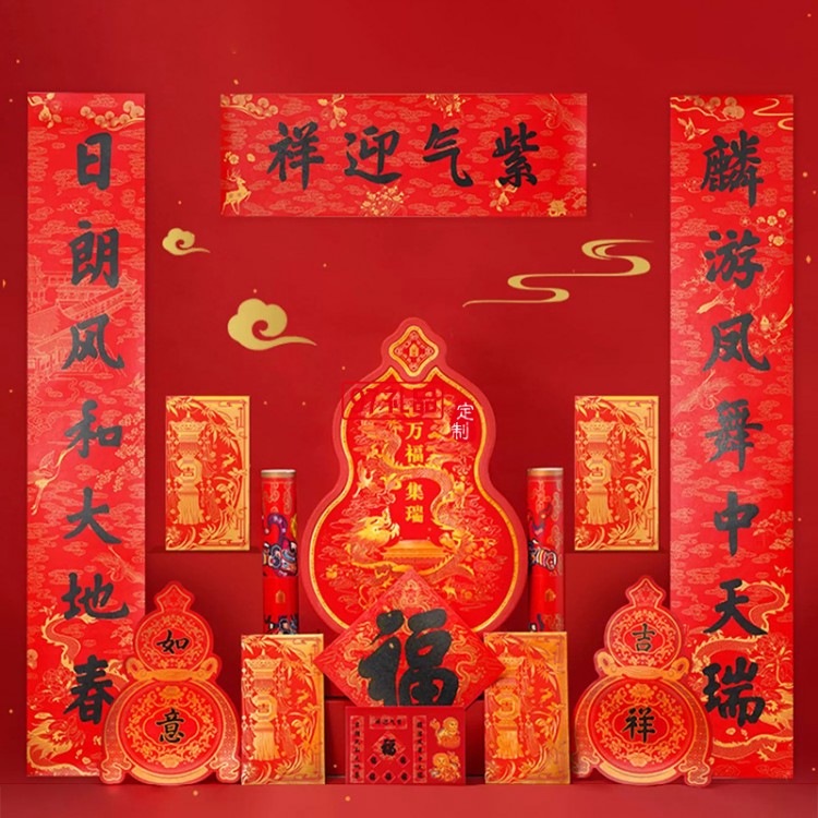 規(guī)格 1套( 春聯(lián)1對:大福字1;橫批1:小福字55;門神一對;冰箱貼1套;紅包*6;福祿春條*4; 窗花*2; 隔條組件1套;無痕點(diǎn)膠60枚: 葫蘆外盒1l; 禮品袋11)